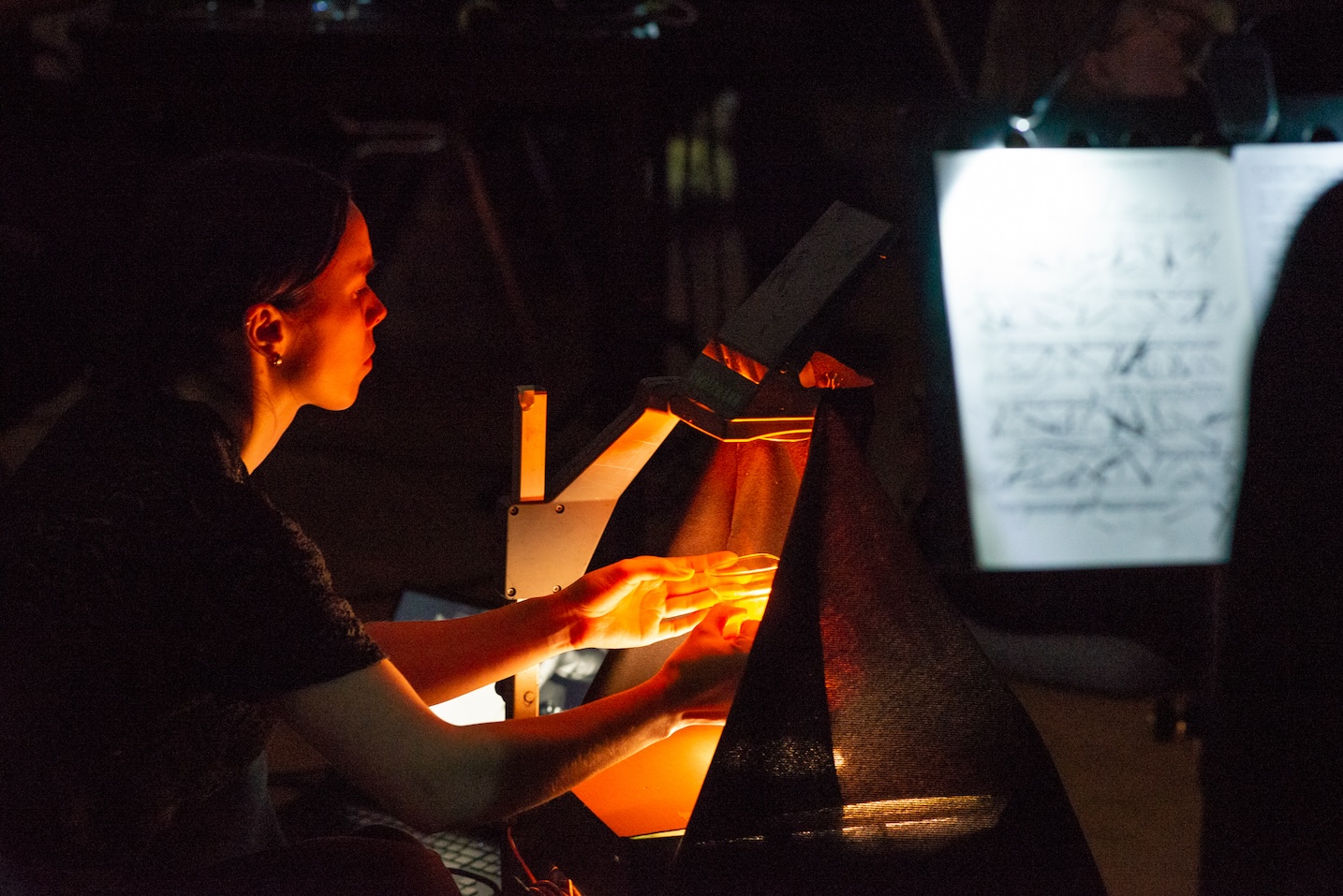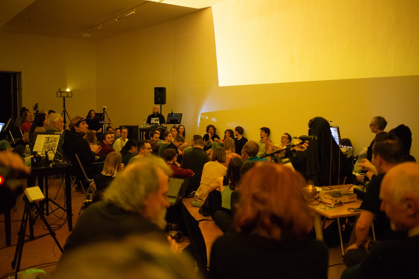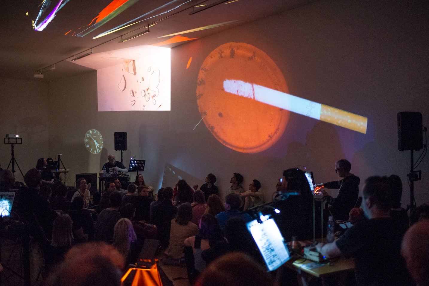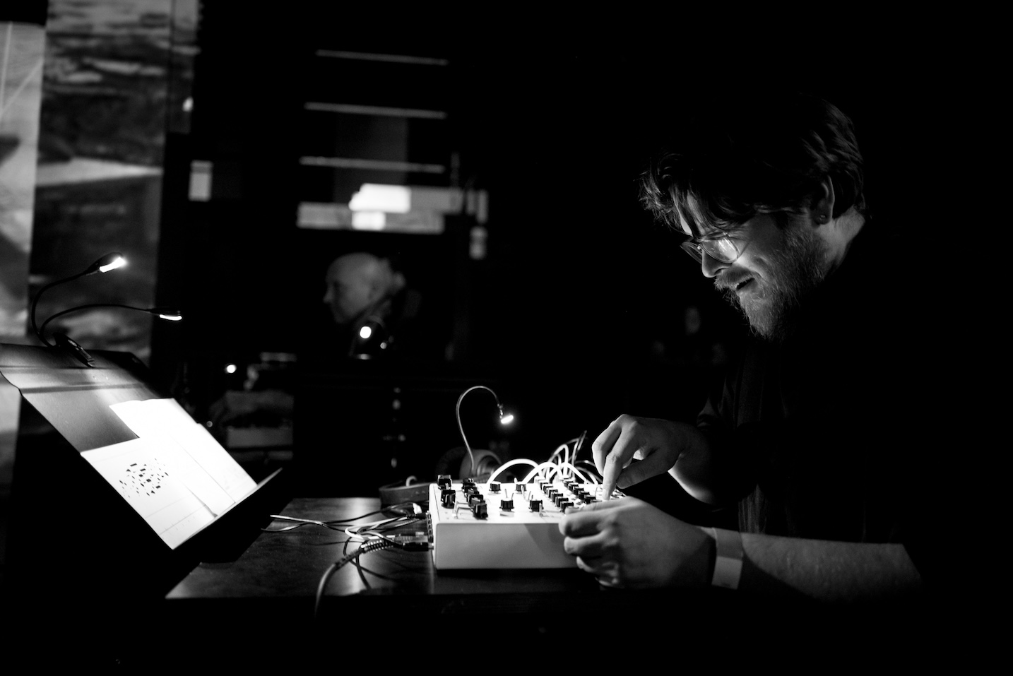 The project focused on performing graphic scores primarily by Czech and Slovak composers in unconventional audiovisual renditions. The international ensemble of this essentially fluid project does not have a permanent team. The audio composition were developed and performed by TomÔŔ KnoflĆÄek (Gurun Gurun) from Ostrava, Michal ZboÅil (IQ+1, B4) from PÅerov, Daniel JakeÅ” (Jasnovidec, Koroze) from High Tatras, Ken Ganfield (PIO, The MoND) from Ames, Martin NĆ”bÄlek (Boyse) from BanskĆ” Bystrica, and Petr Vrba (Poisonous Frequencies, Banausoi) from Prague. All sounds originated in the Lyra synthesizer, which is described as “organismic”, i.e. close to living organisms in its internal interactions and functioning on the basis of imaginary “conversations” between the individual modules…The musical component is complemented by the visuals of Cristina Maldonado, Keya Singh and Isa Juchniewicz, who has created a structured digital environment that both responds directly to the music and allows for an additional layer of improvisation.